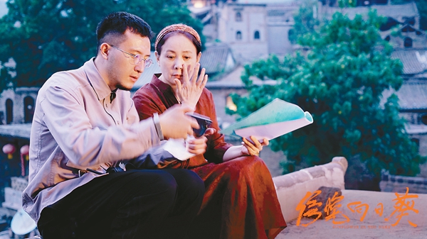 电影《傍晚向日葵》拍摄现场,导演李旭和主演娜仁花在交流剧本