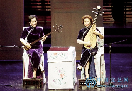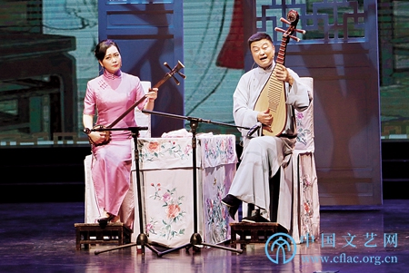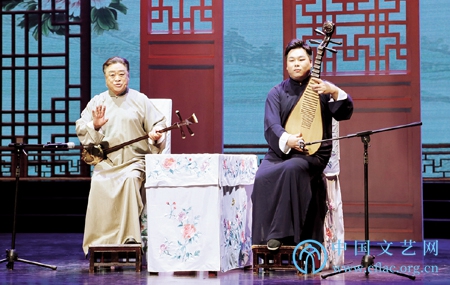 中国曲艺牡丹奖表演奖获得者季静娟(右)和演员陈美东表演苏州评弹