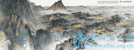 如果把一位优秀且才情丰茂的艺术家的创作轨迹比喻为一条奔涌向前的内心河流,那么,河流两岸不断转换、更迭的葱郁峰峦、锦绣山川则是艺术家绘事心路艰险、辛劳的见证。20多年前,常朝晖便以其个性鲜明、辨识度极高的绘画风格成为全国画坛翘楚。其作品一进入人们的视野(1994年,26岁的他,作品便入选第8届全国美展),便引来学界及社会的广泛关注。正如邵大箴先生所讲:“常朝晖爱用以俯视为主的多种视点来观察和表现自然,常在‘尽收眼底’的描绘中,散发出抒情的诗意,构图别出心裁,画风自成一格。”此时期,常朝辉的作品长于全景式满构图,并用“牛毛皴、解索皴”的笔法交替穿插以及繁密的细笔勾染相互生发。