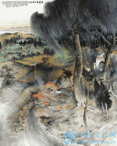 2019年12月20日至2020年1月14日,第13届全国美术作品展览在中国美术馆举行,引起了广泛关注。在本次全国美展中国画展区,一幅由著名画家常朝晖创作的山水作品《在希望的田野上》 ,于众多参展作品中灿然夺目、引人驻足。其画面主体场景的平远开阔、墨色纵横、疏密得体,局部细节中的农机、牲畜,远处的乡间新舍等物象的自然点缀,交织出一派祥和欣然的新时代田野牧耕景象;而近景大树的处理让人颇感意外,这一处理方式,从较大程度上规避了由庸常和流俗带来的表现同质化风险。然而,画家如果没有劈石开山的勇气与自信,是很难把这传统构图样式中的“大忌”处理得如此堂皇而奇巧的。