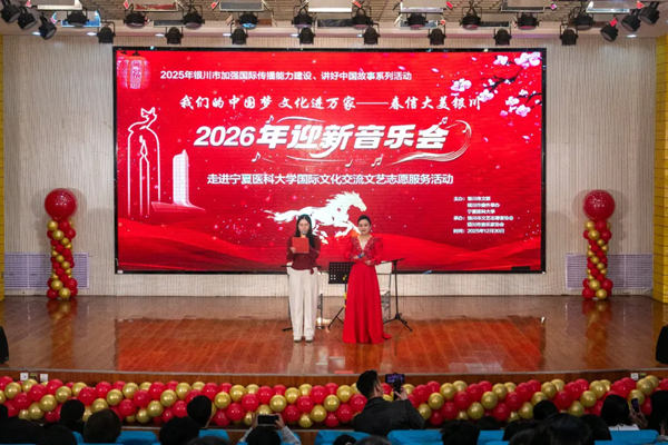 2025年12月30日,由银川市文联、银川市委外事办、宁夏医科大学主办,银川市文艺志愿者协会、银川市音乐家协会承办的“我们的中国梦 文化进万家——春信大美银川 2026年迎新音乐会 ”国际文化交流文艺志愿服务活动在宁夏医科大学举办。银川市15位艺术家用歌曲演唱、中国民乐及西洋乐演奏等丰富的表演内容,为300余名宁夏医科大学外国留学生献上了一台精彩的新年音乐盛宴,送去了银川文艺工作者对他们最美好的新年祝福。