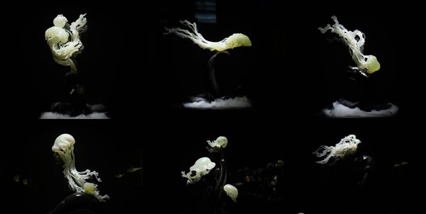 凭借岫玉雕刻《水生世界》系列作品站上领奖台的唐帅从雕刻蔬菜的厨师转型而来。“天底下没有白走的路,厨师也讲究刀法、色彩构成和比例,我是把当厨师学到的雕刻技艺用到我的玉雕里,用敦煌飞天的线条塑造出我们中国玉雕独一无二的灵魂。”这是唐帅从业30年来的集大成之作,他“因材施艺”,根据岫玉的天然形状和纹理,提炼敦煌飞天、唐代“吴带当风”艺术精髓,以S形线条为核心,将东方美学韵律融入玉雕,巧妙设计出了水母的形态,让坚硬的玉石中蕴藏着柔软的灵魂,静止的形态中涌动着无尽的生命力。