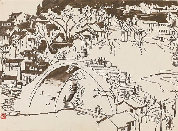 本次展览的一大核心亮点是特设“采象苦学”专题板块,集中展示了李行简几十年如一日积累的速写作品。古人云“搜尽奇峰打草稿”,这在李行简身上得到了完美的诠释。他的写生速写并非简单的素材搜集,而是画家与自然对话的即时心印。其速写不仅是素材的采集,更是对眼力、手力与心力的持续锻造:从桂林江边的渔舟渡口到长江三峡的雄险幽深,从异国街巷的日常景象到建设工地的火热场景,笔下所记皆为对现实与自然的深度观察。“他的写生作品,构图严谨,笔墨浑厚,无论在风格面貌上,抑或在气势神韵上,都能见出可染先生的艺术风范,堪称是李派山水中的上乘之作。”艺术理论家王宏建曾这样评价。