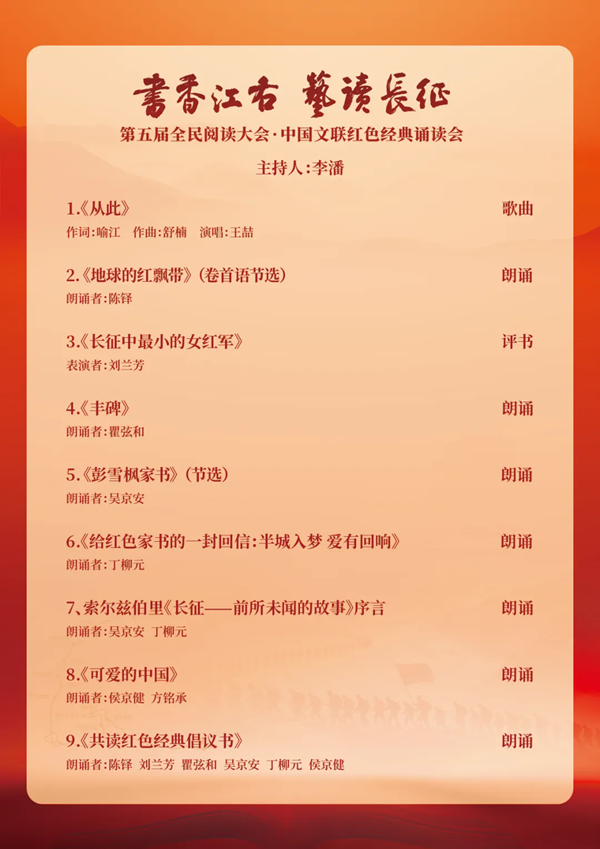 落霞与孤鹜齐飞,诵读与初心同行。4月20日下午,“书香江右 艺读长征——第五届全民阅读大会·中国文联红色经典诵读会”在滕王阁古戏台举办。本次活动由中国文联主办,中国文联出版办、江西省文联承办,中国文联理论研究室、中国电影家协会、中国电视艺术家协会、中国文联文艺志愿服务中心、中国文联网络文艺传播中心、中国艺术报社、中国文联出版社有限公司、中国文艺网协办。
