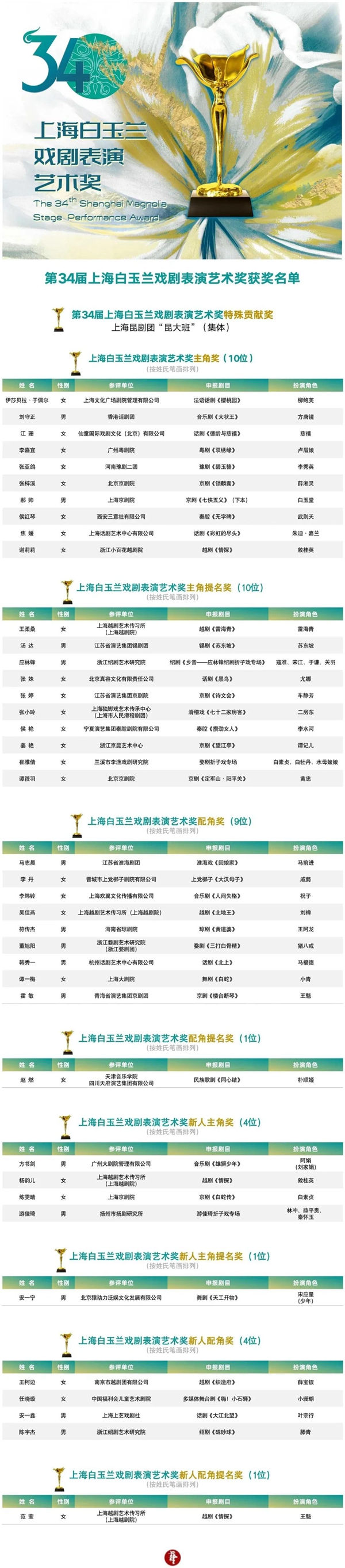 第34届上海白玉兰戏剧表演艺术奖获奖名单公布
