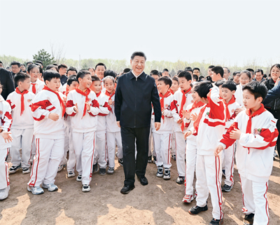 2024年4月3日,党和国家领导人习近平、李强、赵乐际、王沪宁、蔡奇、丁薛祥、李希、韩正等来到北京市通州区潞城镇参加首都义务植树活动。这是习近平同少先队员在一起。 新华社记者 李学仁/摄