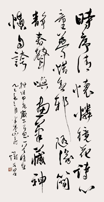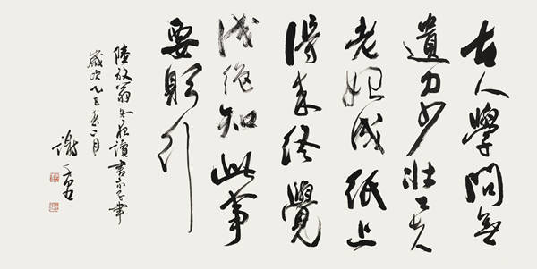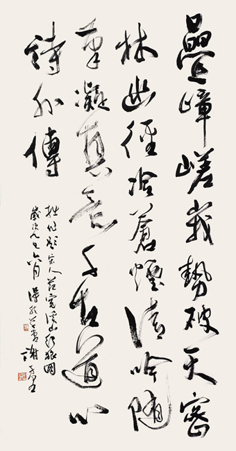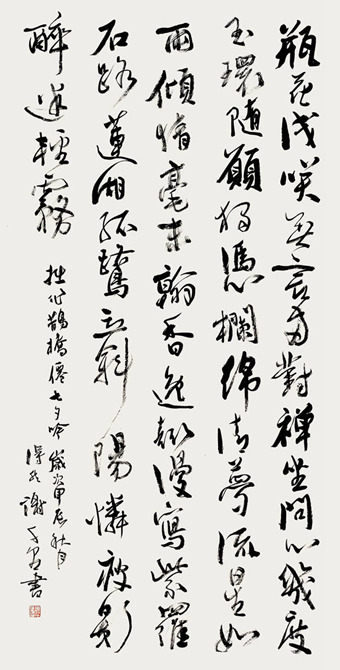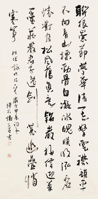 谢千里,生于1966年,江苏南京人,南京艺术学院书法篆刻专业。擅长诗联,精通书法五体,好写梅竹荷藤,也兼画山水,用笔洒脱,寓道于笔墨。