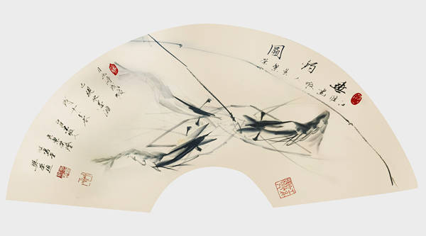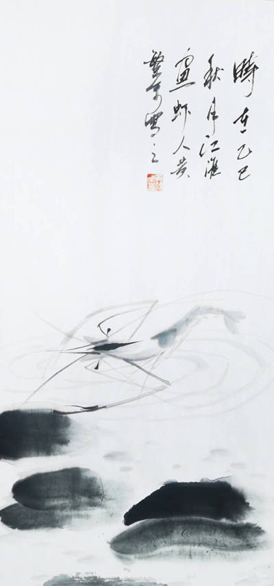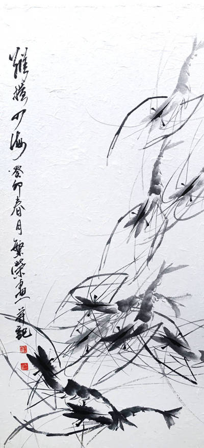 其创作以水墨虾画为核心,形成自己“江淮虾画”体系:以长江江虾为原型,通过拟人化笔触赋予虾群灵动生命感,虾壳肌理与虾须劲韧的刻画尤为精妙。