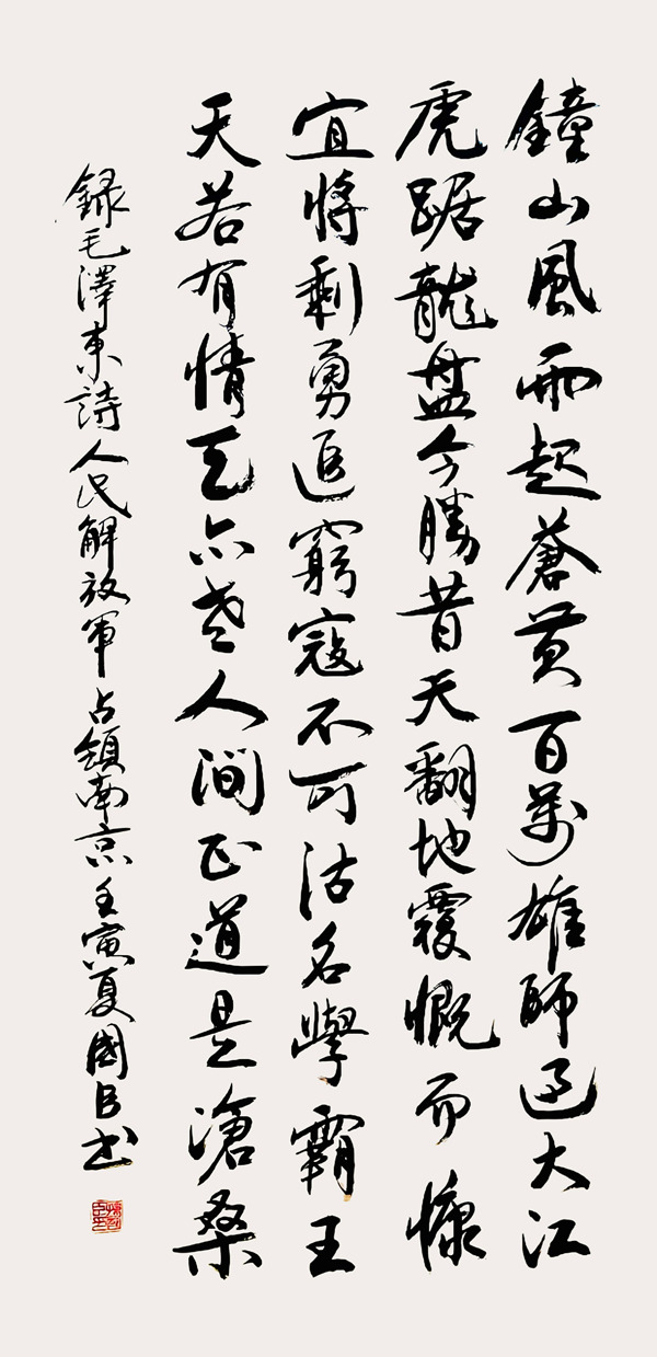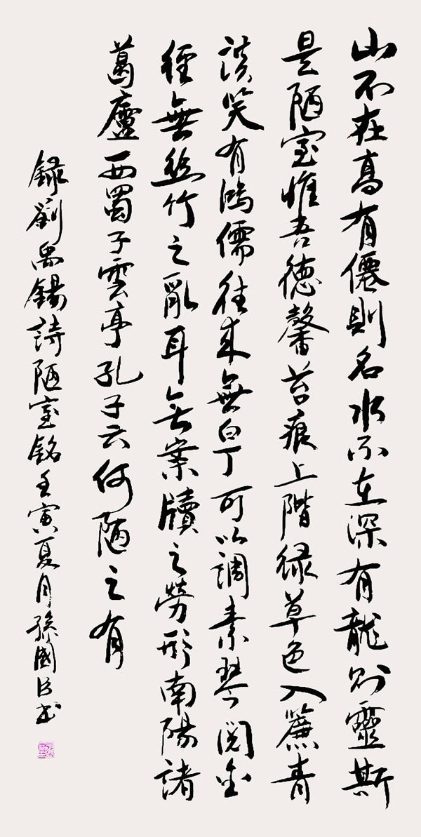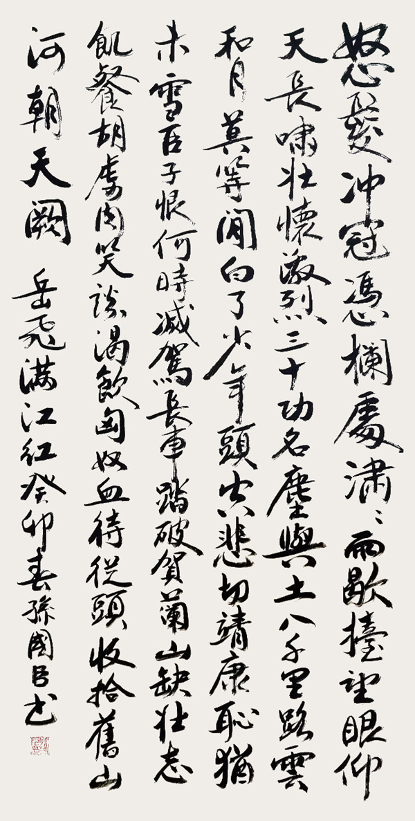 其书法作品风格独特、技艺精湛,他的笔法清逸潇酒,节奏明快,用墨浓淡相间,枯实互应,结体长于易位、清劲挺拔,章法或大或小,错落有致,笔势成熟稳健,收放自如,线条自由奔放,浑然天成,他以二王法度为核心,深师历代名家法帖,取法正宗,在传承中不断创新,形成了自己中正平和又不失个性的书风。