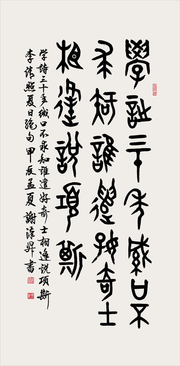 他研习历代各种书体,笔耕不辍,作品融合了传统与现代元素,既有深厚的传统功底,又有现代审美和创新意识。