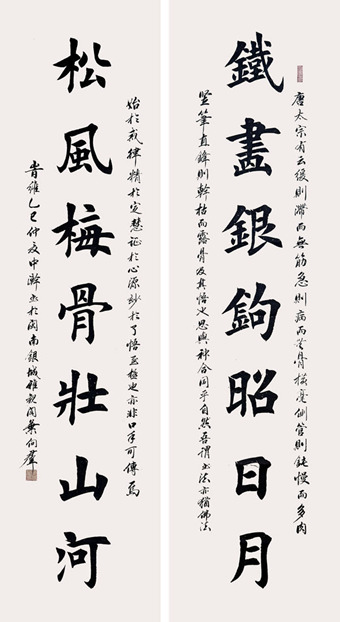 自创对联:赞欧楷书体《铁画银钩照日月,松风梅骨壮山河》180cmx49cmx2
