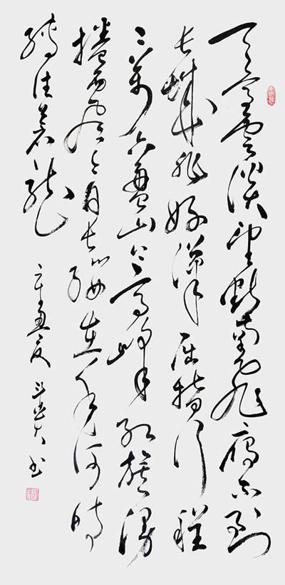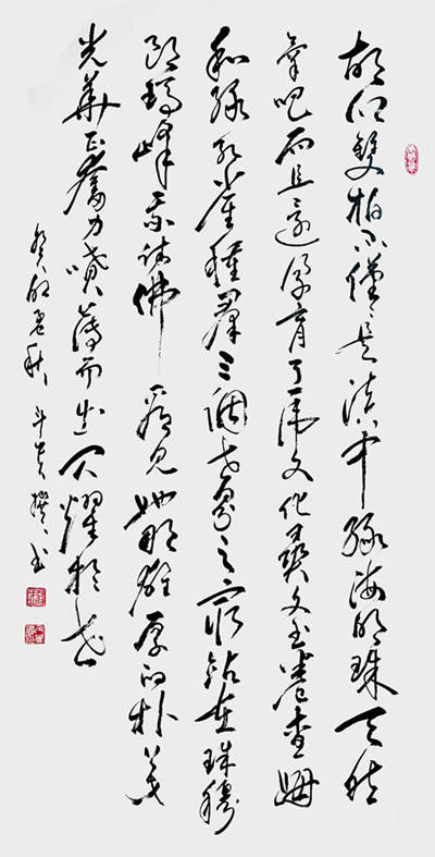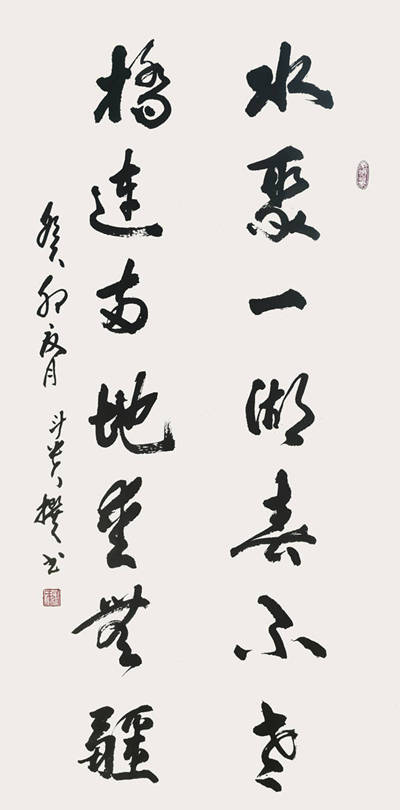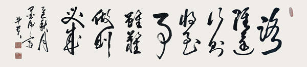 其书法创作以“碑帖融合”为核心理念,早年受云南地方碑刻影响,后系统研习欧阳询楷书与米芾行草。以隶书、草书见长,整体风格注重“中庸”之道,追求笔墨的收放自如。