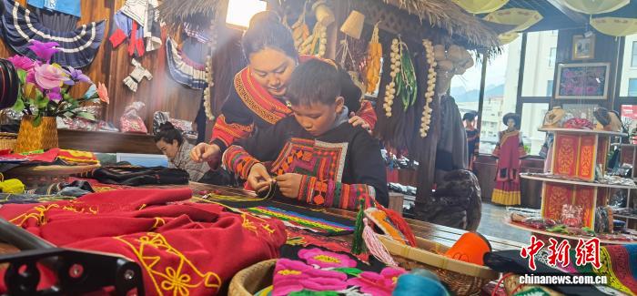 图为第十四届全国人大代表乔进双梅(左)向青少年传授彝绣技艺。受访者供图