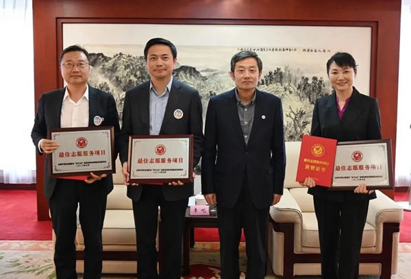 中国文联党组成员、副主席诸迪为2022年度全国学雷锋志愿服务“四个100”最佳志愿服务项目代表李昕、何思清、居杨颁发证书、奖牌