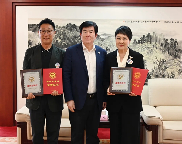 中国文联党组书记、副主席李屹为2022年度全国学雷锋志愿服务“四个100”最美志愿者林永健、张凯丽颁发证书、奖牌
