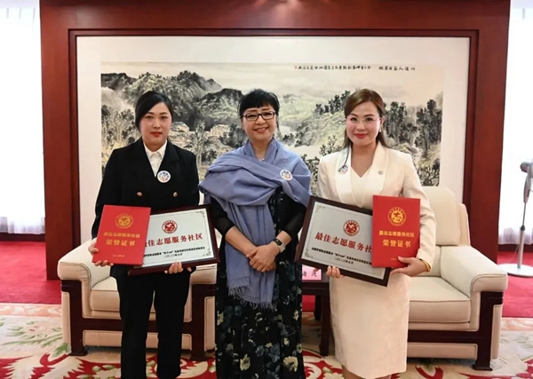 中国文艺志愿者协会主席殷秀梅为2022年度全国学雷锋志愿服务“四个100”最佳志愿服务社区代表崔艳花、林莉婷颁发证书、奖牌