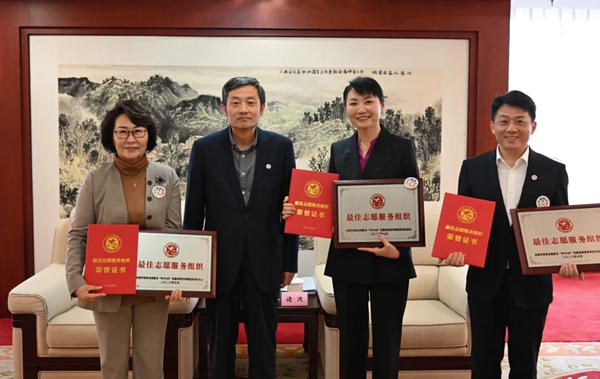 中国文联党组成员、副主席诸迪为2022年度全国学雷锋志愿服务“四个100”最佳志愿服务组织代表居杨、金鹏、崔红女颁发证书、奖牌