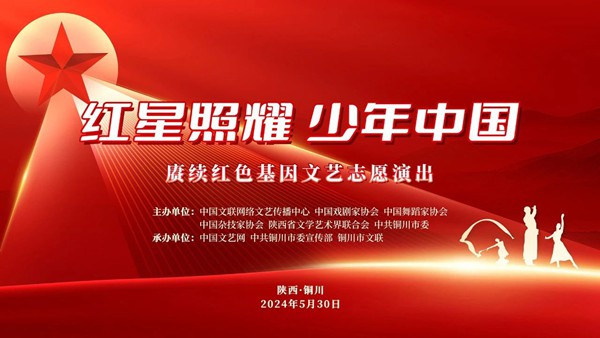 2024年5月30日,正值习近平总书记给陕西照金北梁红军小学学生回信6周年。为深入学习贯彻习近平文化思想,全面落实中国文联十一届四次全委会精神,由中国文联网络文艺传播中心、中国戏剧家协会、中国舞蹈家协会、中国杂技家协会、陕西省文联、中共铜川市委共同主办,中国文艺网、中共铜川市委宣传部、铜川市文联承办的 “红星照耀 少年中国”——赓续红色基因文艺志愿演出在陕西省铜川市铜川剧院举行。