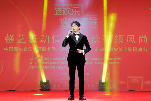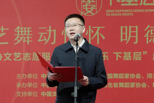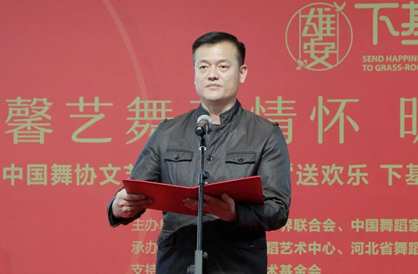 3月15日,“馨艺舞动情怀 明德引领风尚”中国舞协文艺志愿服务团“送欢乐·下基层“赴雄安新区慰问演出举行。图为中国舞协分党组成员、秘书长夏小虎致辞。