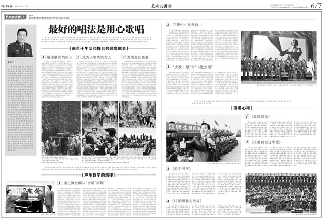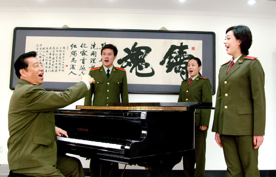 再次是情感。有了对生活的体验,有了作为抒情主体或者倾诉对象的人物,剩下的就是情感的表达。情感的表达是歌曲和歌唱的第一要务。任何一首歌曲都诉诸情感的表达,有亲情、友情、爱情等等。一个歌手的歌唱要真正打动听众,关键在于真心、真挚、真诚的情感表达。要做到这个“真”字,需要对生活的体验和感悟,需要对歌曲中人物的准确把握,更需要一个歌者珍藏在心中的爱和感恩。比如说,我唱《再见吧,妈妈》,其中包含着一种真爱和感恩。因为我把歌中的那个“妈妈”当做了自己的妈妈,所想到的也是我本人即将离别妈妈去南疆进行战地慰问演出时的情景。我唱《没有强大的祖国,哪有幸福的家》时,我就把歌中的那个“妈妈”(原型为全国著名拥军模范赵趁妮)当成了自己的妈妈。这样一来,我和人物的距离就拉近了,所表达的情感自然就是一种真情。我唱《北京颂歌》《我爱五指山,我爱万泉河》等歌曲时,内心也总是充满着感恩。我在唱《战士歌唱毛主席》《毛主席的恩情比山高比水长》《想起周总理纺线线》《八十抒怀》等歌唱领袖人物的歌曲时,总是先将领袖人物当成自己的亲人,从亲情出发,然后再升华出一个战士对革命领袖的深厚感情。这之中就有一种感恩。作为一个军旅歌手,我演唱了许多军旅歌曲,其中也饱含着对军队和战士的爱。总之,真情源自真爱,用爱传情或许是表达真情的最佳形式。