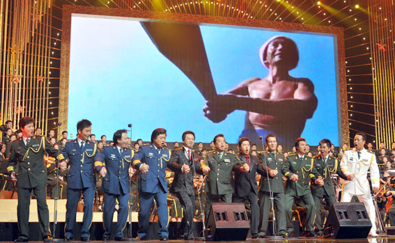 在国家大剧院举办的“李双江战友·师生音乐会”上,李双江与战友和他的男高音弟子们合唱《船工号子》