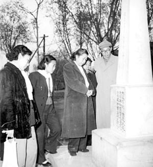一九六○年四月十三日邓颖超一行在陶然亭公园内高君宇、石评梅墓前。左起:林玉华、周秉德、邓颖超、赖祖烈、孔原 摄影 张 彬