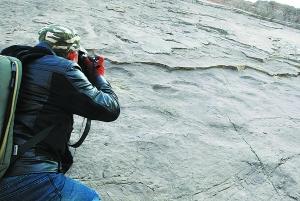 昨天,一名记者在延庆硅化木国家地质公园恐龙足迹化石发现处拍摄恐龙化石足迹。本报记者 吴镝摄