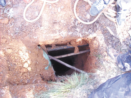 经现场勘查,发现一处深达11米的新掘盗洞,盗洞直径60至70厘米,可容一人通过。盗墓贼可能先是在山顶炸开口子,然后用吊绳放人和铲子下到洞穴中,将泥土挖松吊出。警方在洞内发现藏有发电机、鼓风机、通风管、绳梯、乳化炸药等挖掘工具和物品。