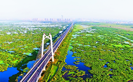 黑龙江大庆,横跨龙凤湿地自然保护区的龙凤湿地大桥。新华社发
