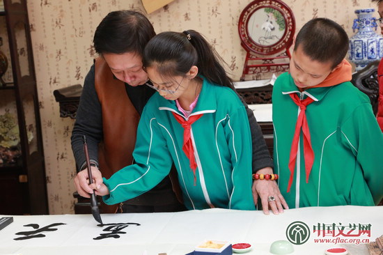 在展览路第一小学,中国书协外联部主任张艺群以及首都师范大学教授魏家川在指导学生书法技巧的同时亲自示范,挥毫泼墨写下了《晴耕雨读》《宁静致远》《博观约取》《崇德力行》等作品赠予学校。学生们围在艺术家身边,仔细观看,不时提出各种问题。来自中国中国美协的年轻美术家逄羽、刘婷则给学生们上起了生动的美术课,并示范了山水画中常见的石头、树木等绘画技法。孙明亮、张希红、朱宝祺3位来自中国摄协的老师代表中国摄协摄影函授学校给学生们赠送了《青少年摄影教程》以及中国梦主题摄影海报。