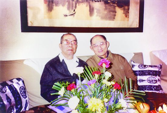 1999年,张庚89岁生日时,沈达人(右)与张庚先生合影