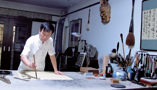 在2010年于炎黄艺术馆举办的“全国中青年书法二十家”展览上,参展的当代中国书坛中青年才俊之力作奇趣异彩、技巧炫目,看来让人如游奇峰险岭,转到一位书家平实拙朴、素面朝天的汉隶面前,突然有种一马平川、步履沉稳有力的感觉,或是欣赏现代摇滚乐后突然入耳一首古典民乐,感官与心灵都开始安静、开始浸入一种澄明天地。记者留心看展签,书家是张建会。找到张建会相聊,其憨朴醇厚、亲切随和一样让人感觉安静、平等、踏实,而又大智若愚。一年多时间中,记者数度与张建会先生相逢,渐渐了解了他那被天津文联党组书记孙福海形容为“豁得出去”的书法人生。