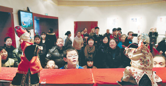 国家大剧院艺术沙龙展厅迎来了“走近非物质文化遗产——漳州布袋木偶艺术展”,展览期从2月13日延续至3月9日。此次展览由国家大剧院与漳州竹初木偶艺术馆共同举办。漳州竹初木偶艺术馆由漳州木偶代表传承人徐竹初先生建立,是中国第一家专业木偶艺术馆,展品曾到美、英、法、德、俄等100多个国家和地区展出。据展览负责人介绍,展览期间每天上下午将上演两场布袋木偶戏,生动活泼,妙趣横生,让观众在动静结合中体会这一古老艺术的魅力。图为表演现场。