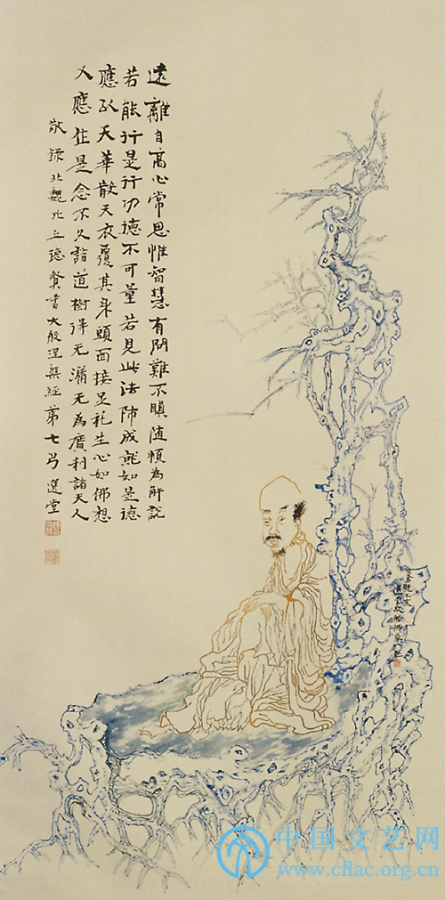 在文人画的各种题材中,作品所表现的文人的生活方式也是重要的内容,文人的怀古、寻古、鉴古,发思古之幽情,常常出现在画面中而表现出特别的文化内涵。在饶宗颐一生多样的学问中,敦煌学的成果最为耀眼——1978年,出版了《敦煌白画》;1983年到1986年间还主编了《敦煌书法丛刊》共29册;1990年创办《香港敦煌吐鲁番研究中心丛刊》,出版了《敦煌琵琶谱》,同时还发表了《围陀与敦煌壁画》《敦煌石窟的尼沙》《刘萨诃事迹与瑞像图》《敦煌白画导论》《跋敦煌本白泽精恠图两残卷》等论文。在敦煌和西域地区的考察中,饶宗颐不仅画了一些“西北宗”题材的画作,表现了他对西北山水的特别感觉,还在研究敦煌书法和壁画的基础上,挖掘敦煌白画资源,寻找壁画中感兴趣的内容,创作了一批属于他自己的敦煌题材的作品。他以敦煌壁画为原始素材,选取其中的形象作为独立单元,用白描法画出形象,往往使用金墨勾线,或成为线描,如取莫高窟314号隋窟藻井上的菩萨造型而成的《莲座菩萨》;或配景,以表现佛、菩萨与现实人间景象的关系,如《无量寿佛》,以及参照“敦煌盛唐思维菩萨画像”而成的《思维菩萨》。这些来自敦煌的佛与菩萨,如果失去了学术支撑,就不可能有它特别的意义。“以敦煌白画笔意,合元人墨法”,写《松竹如来》,同样是饶宗颐的另外一种想法。所谓的融通,还包括在专业方面的由此及彼,触类旁通。
