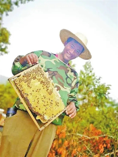 佤族小伙岩枪在养蜂场工作