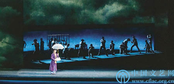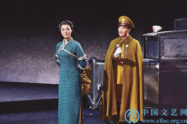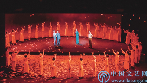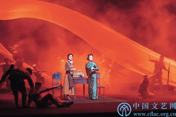 作为舞台剧,《枫叶如花》带给观众最强烈的感受是犹如电影大片。首先是人物造型复古。刑场上荷枪列队、身着国民党黄呢军服的行刑队,码头上一袭白色水手服的海军鼓乐队,夜间手执电筒、神出鬼没的特务队,群舞表演色调丰富,十分炫酷。肖靖光的洋装,李孝乾的长衫马褂,谷宪文的中山装,华枫几套配饰多样、精致考究的旗袍,以历史照片为参照,逼真且富时尚感。其次是舞台简约却很有年代感。复古的家具陈设,特意做旧的道具效果,散发出古色古香的味道。转台的多次利用不仅配合场景的迅速切换,还为舞台营造蒙太奇效果提供助益,在明暗灯光的掩映下透出邈远悠长的视觉效果。最令人印象深刻的一个场景是华枫和肖靖光听国民党电台播报战况,想象前线的浴血奋战。此时台上出现战士冲锋牺牲的群舞,暗红及金色交织的灯光与飘扬全场的意象化的长绸旗帜映衬出舞蹈演员错落参差的造型,犹如动态化的雕塑,而肖、华二人伫立于前景的白色追光之下,巧妙嵌入整体场景,与歌舞的关系既有融入又有间离,呈现出电影的叠化效果,很具视觉穿透力。