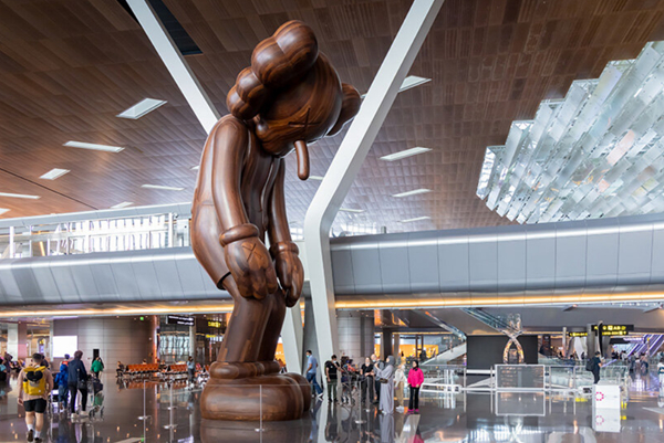 当游客抵达卡塔尔,踏入哈马德国际机场,便会见到美国潮流艺术家KAWS与博物馆合作建成的高9.7米的雕塑作品《Small Lie》。KAWS表示:“创造灵感来自于我和小时候玩过的木制玩具的关系以及木纹所带来的温暖感觉。我在这一点上进行发挥,创造了一座超大雕塑,来展现力量和善良之间的情感张力。”