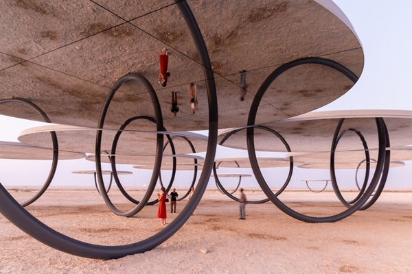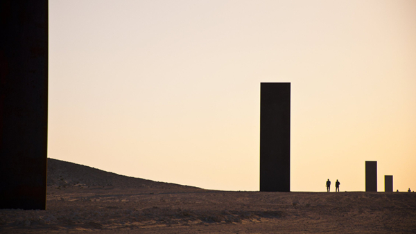 《East-West/West-East》坐落在多哈北部基克里特外部的石灰岩层之间,由四块钢板组成,每一块钢板高度均超过 14 米,装置长度绵延超过 1 公里。