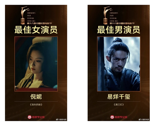 9月2日,第十八届中国长春电影节“金鹿奖”获奖名单揭晓。易烊千玺凭借《满江红》获第十八届中国长春电影节“金鹿奖”最佳男演员奖。倪妮凭借《消失的她》获第十八届中国长春电影节“金鹿奖”最佳女演员奖。电影节闭幕式暨颁奖典礼于9月8日晚播出。