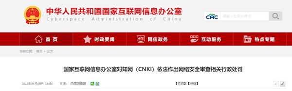 9月6日,国家网信办发布消息称,对知网(CNKI)依法作出网络安全审查相关行政处罚,责令其停止违法处理个人信息行为,并处人民币5000万元罚款。