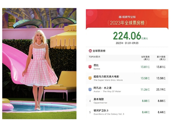 9月3日,据猫眼专业版全球票房数据显示,电影《芭比》累计票房突破13.81亿美元,超《超级马力欧兄弟大电影》票房成绩,登顶2023年全球票房榜。同时也超越了《哈利·波特与死亡圣器(下)》(累计13.4亿美元),成为华纳兄弟史上最高票房影片。