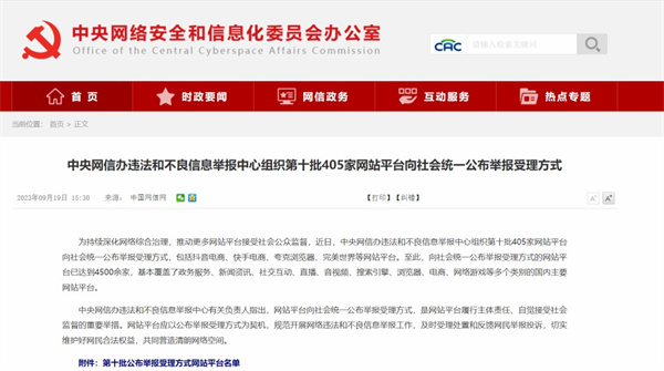 中央网信办:第十批405家网站平台公布举报受理方式