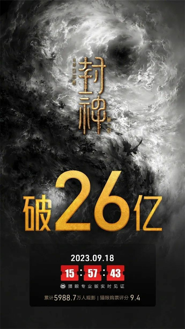 日前,《封神第一部》发布英文版海报,定档9月22日在英国、爱尔兰正式上映。9月18日,《封神第一部》中国内地票房已超26亿。此前,影片在第80届威尼斯国际电影节上进行市场放映,并已在中国香港、北美、澳洲、新西兰院线定档。