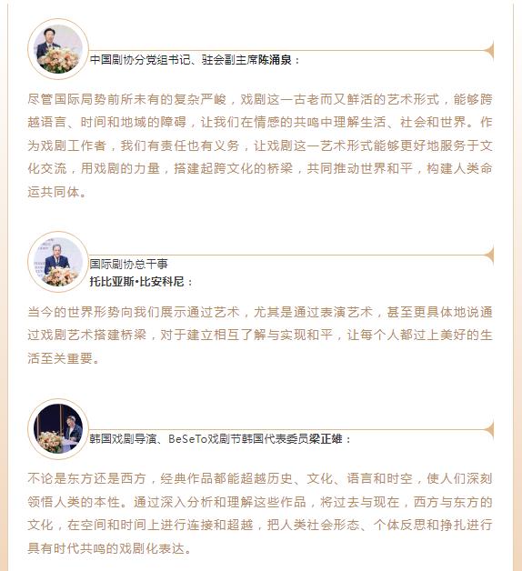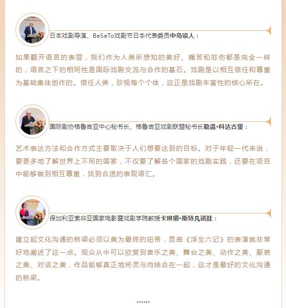 丰富多元的展演剧目和戏剧人论坛共同勾勒中外戏剧文化交流的美丽画卷,中国戏剧工作者和观众进一步了解了当今世界戏剧的发展趋势和当代戏剧的艺术风貌,世界戏剧人也进一步感受了中国戏剧的无限魅力,共同推动世界戏剧的繁荣与发展。