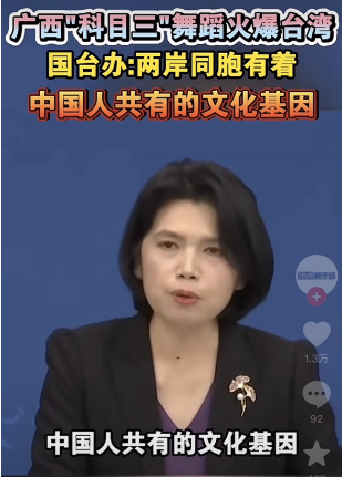 国台办发言人朱凤莲回应称,一首歌曲、一段舞步或一种美食会很快火爆两岸网络,比如之前看到的《孤勇者》《小小花园》《求佛》,还有螺蛳粉等,这是两岸青年在网络时代独特的交流方式,也是两岸融合发展过程中新的文化交流现象。