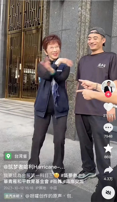 不少台湾博主也加入潮流,在学校、广场、家中,和家人、朋友一起跳“科目三”。有网友戏称“车同轨,书同文,舞同步”。前不久,台湾霹雳舞舞者田晋瑜的“挑战科目三”视频中,有年轻人表示“全班都会跳”,连中国国民党前主席洪秀柱都一边说着“很简单,小意思啦”,一边跟着示范摇起花手。