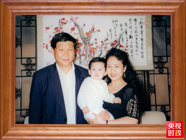 这是习近平一家三口的合影。这张照片第一次出现在他的书架上。