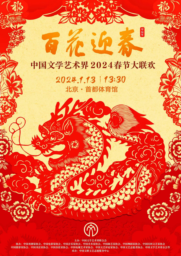 1月13日,由中国文联主办、中国文联文艺志愿服务中心承办、各全国文艺家协会协办的“百花迎春——中国文学艺术界2024春节大联欢”在北京举行。本次大联欢以“龙腾万里 百花迎春”为主题,老中青艺术家同台献礼,各艺术门类精品力作汇聚一堂,展现文联文艺工作新气象新作为。(文字来源:中国艺术报)