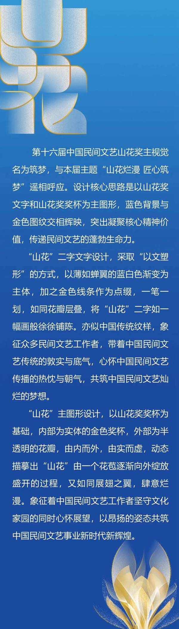 中国民间文艺山花奖是中宣部批准,由中国文学艺术界联合会和中国民间文艺家协会联合主办的中国民间文艺最高奖,以表彰传承中华美学精神、表现时代主题、弘扬社会主义核心价值观的民间文艺作品和成绩突出、德艺双馨的民间文艺工作者,至今已成功举办16届。多年来,山花奖的评选宗旨始终坚持“二为”方向和“双百”方针,鼓励多出精品,多出人才,为传承中华优秀传统文化、促进民间文艺繁荣发展做出了积极贡献。