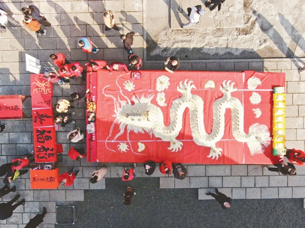 在福州晋安区,一条用八百余斤大米、历经三小时摆成的七米多长的“米龙”,栩栩如生、威武非凡。